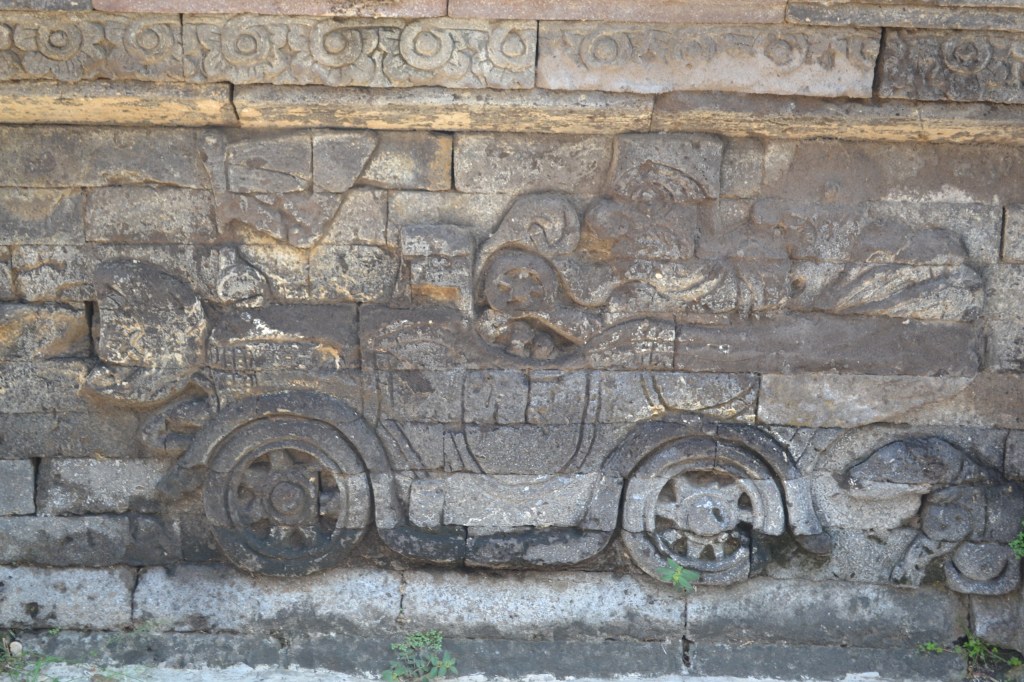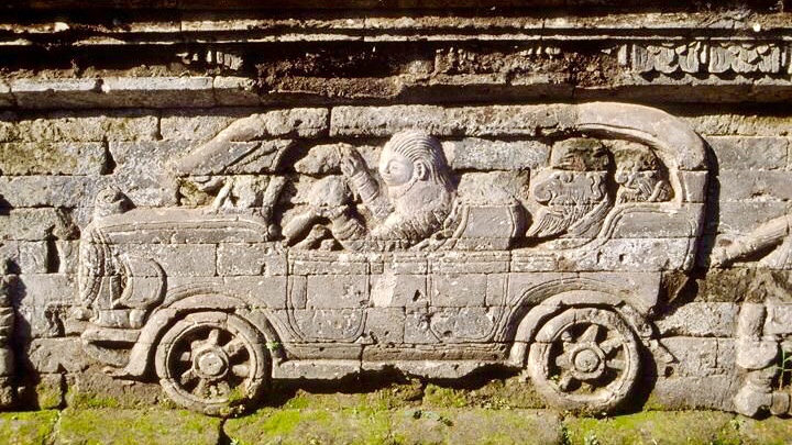 After the war, the temple was pretty damaged and the villagers have reconstructed the temple. The walls were rebuilt and on the outside you will find sculptures of the Dutch who sit in a car, also there are sculptures of an airplane, bicycle and boat, probably this is the way how the people saw the Dutch, but it is not entirely clear why these sculptures are on the wall.