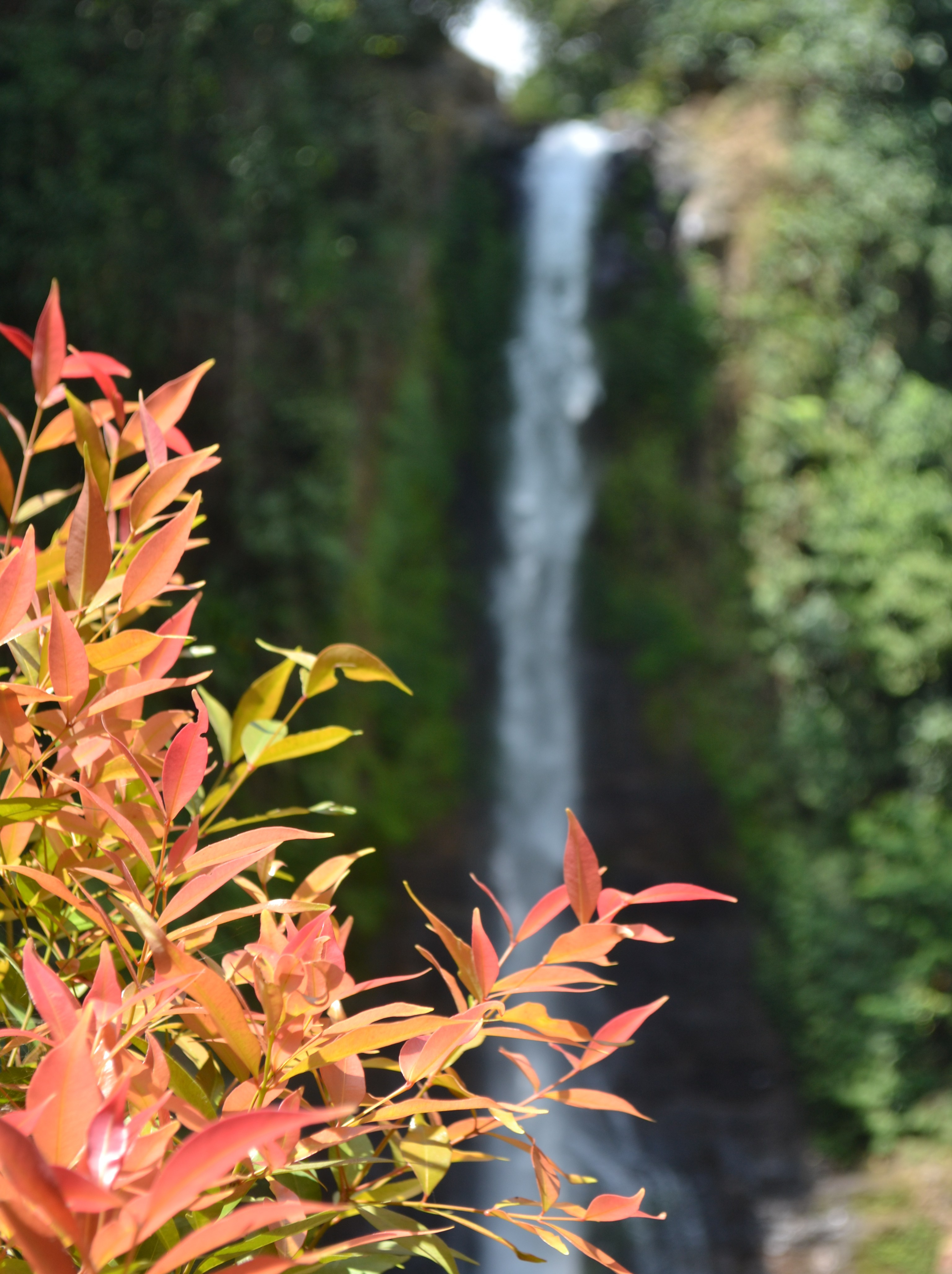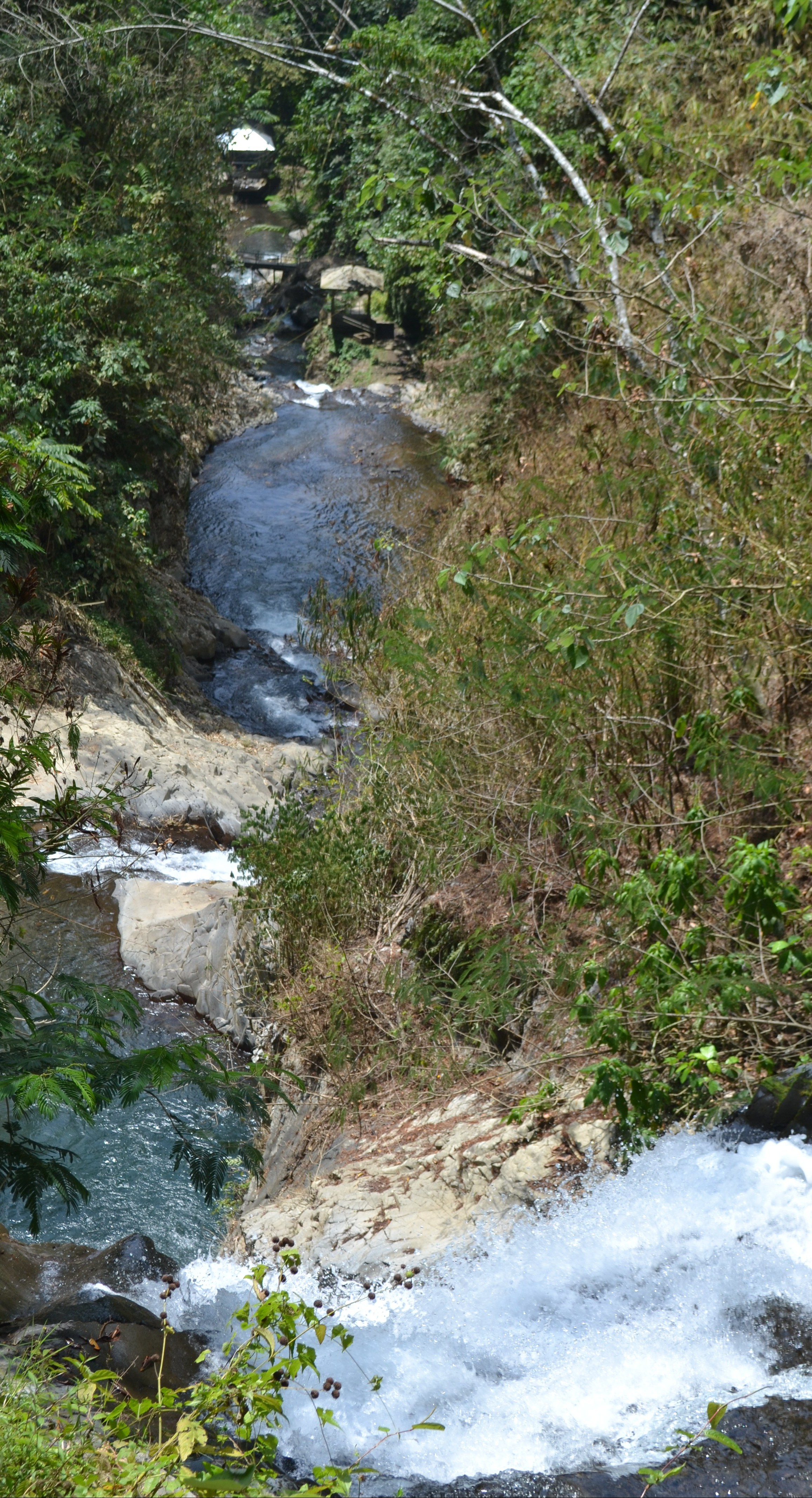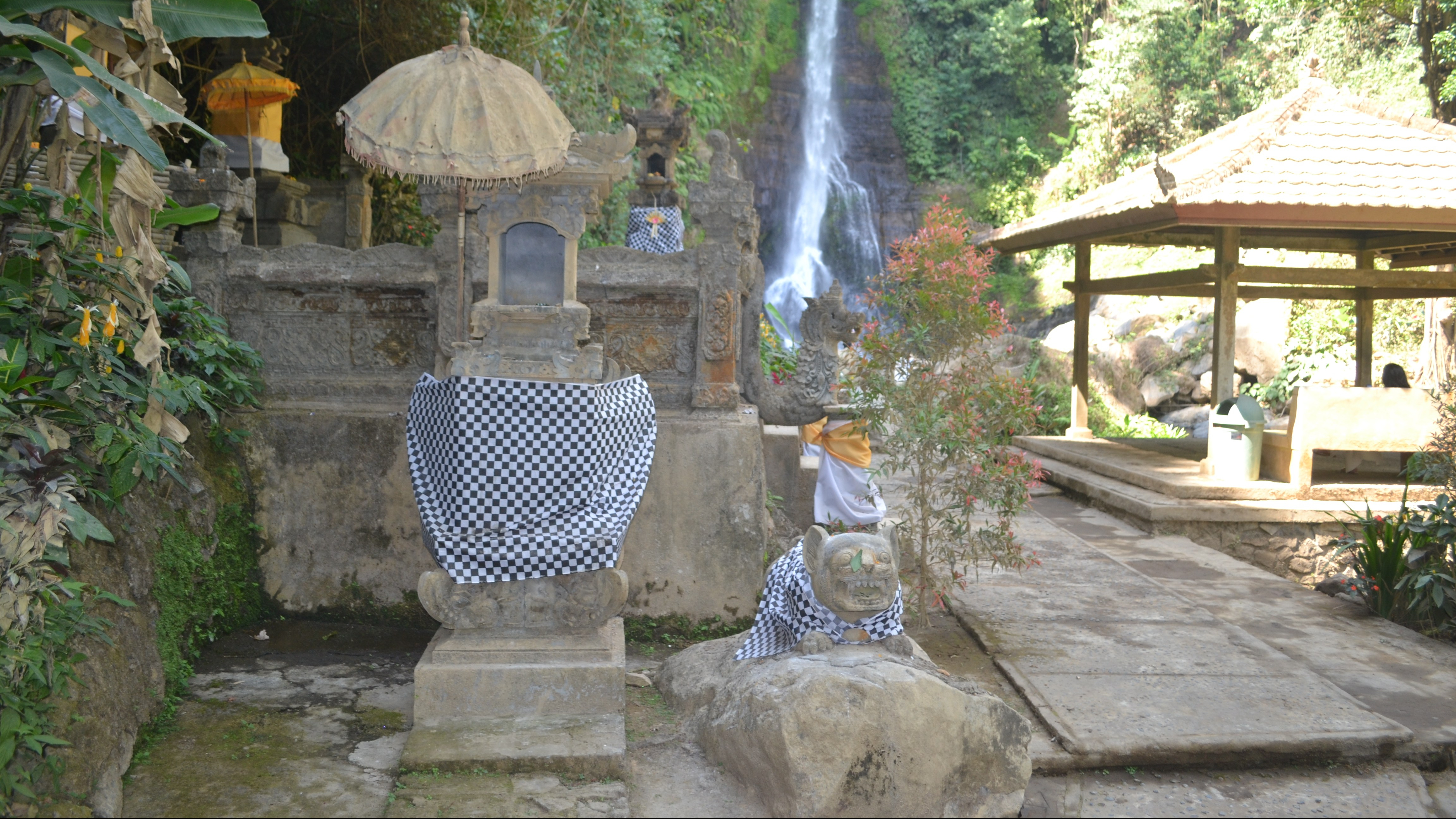 Once you arrive at the waterfall, you actually walk to the end of the valley where the water falls down through the mountainside, the water then flows further away into a kind of river with many large rocks, it is a beautiful piece of nature, there is a temple, a bale and beautiful flowers grow there.