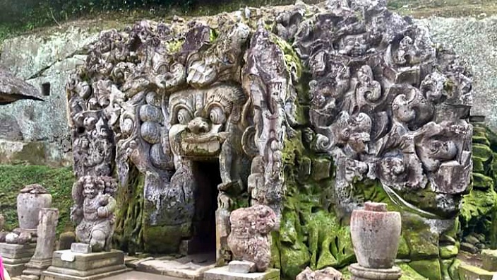 Elephant Cave also known as Goa Gajah and is located in the village of Bedulu (close to Ubud). It was built in the 9th century and served as a sanctuary, although the exact origin of the cave is uncertain, one story that it was created by the fingernail of the legendary giant Kebo Iwa. The complex contains both Hindu and Buddhist imagery, as the cave contains the some kind of altar with symbol of Shiva and the image of Ganesha, while by the river there are carved images of stupas and chattra which are related to Buddhism.