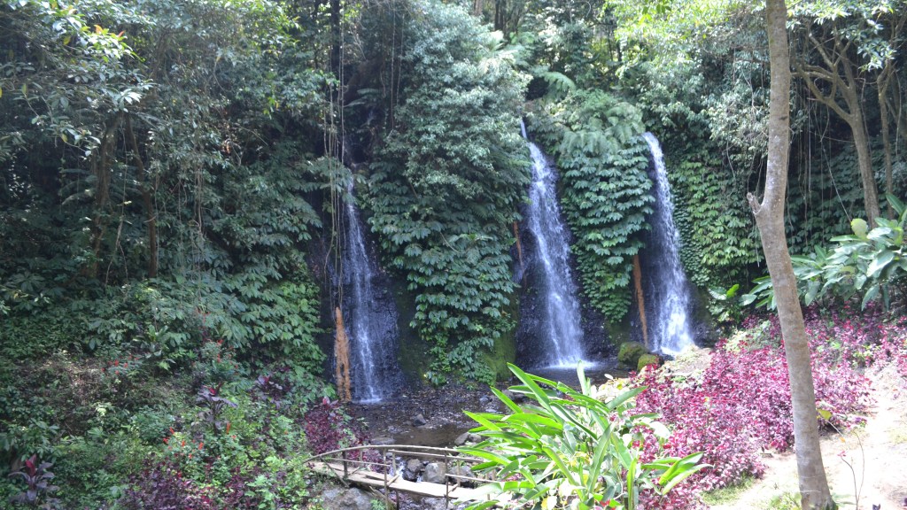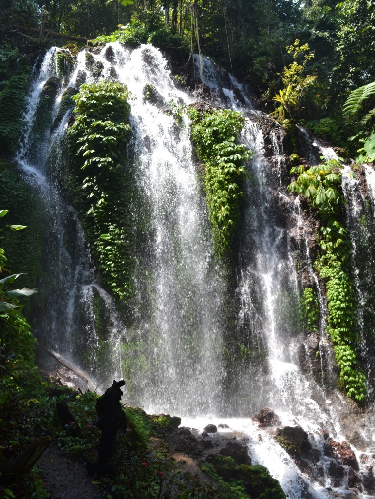 Banyu Wana Amertha waterfall, located in the village of Bhuanasari (near Wanagiri) and about a 30 minutes drive from Lovina. From the main road along the Twin Lakes you turn left somewhere (there is a large sign) into a road and after 2 km you arrive at the parkinglot of the waterfall, there is also the entrance and you pay 30,000 rp. Then the walk can begin, 500 meters the sign says but might be more, walking on uneven tiles, a sandy path and a concrete path and it goes up and down steeply.