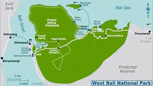 Located in the most north-west point of Bali, the national park includes the whole area of the Prapat Agung Peninsula and large swathes of land around the towns of Gilimanuk, Cekik and Banyuwedang which are located in the regencies of Jembrana and Buleleng.