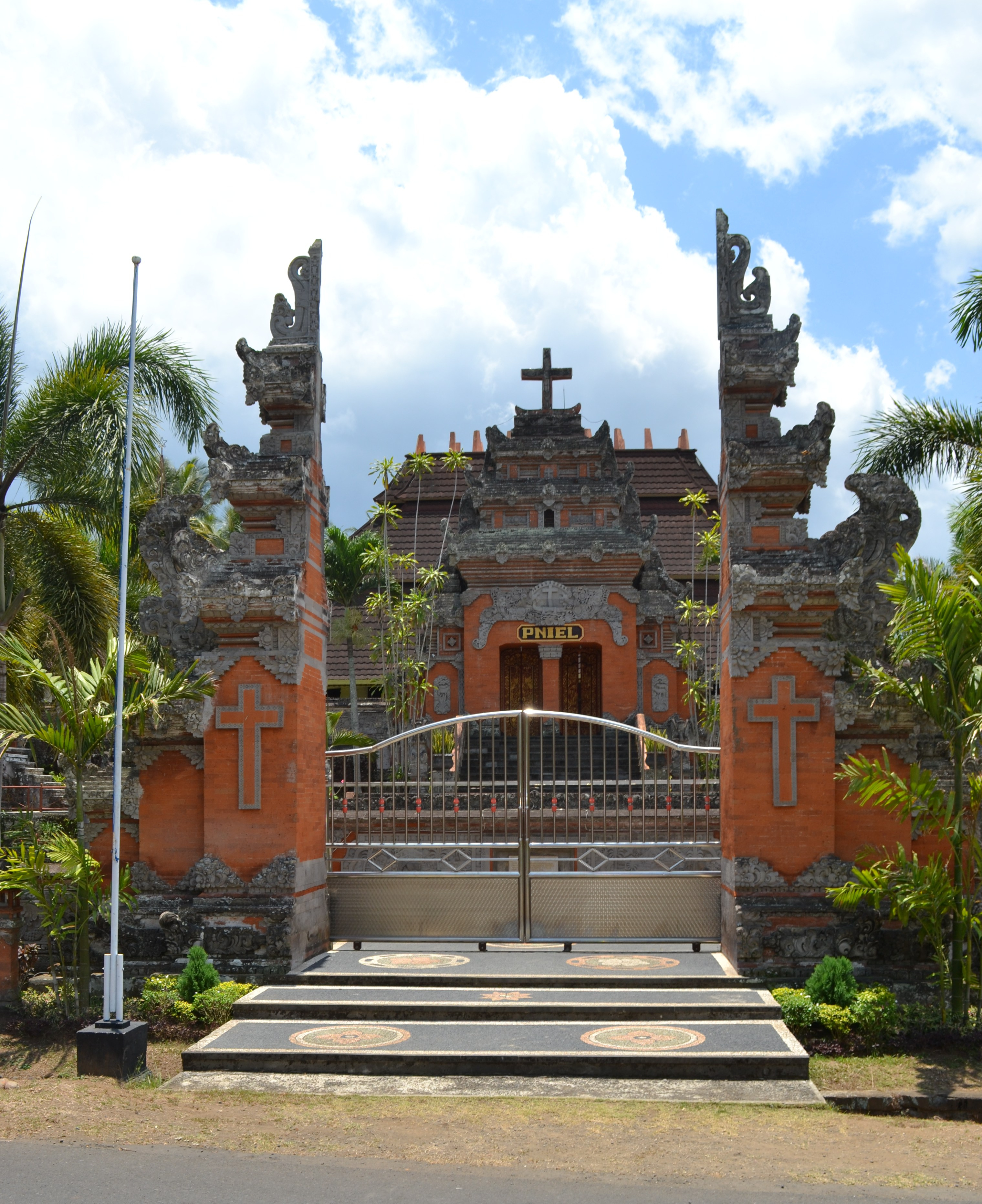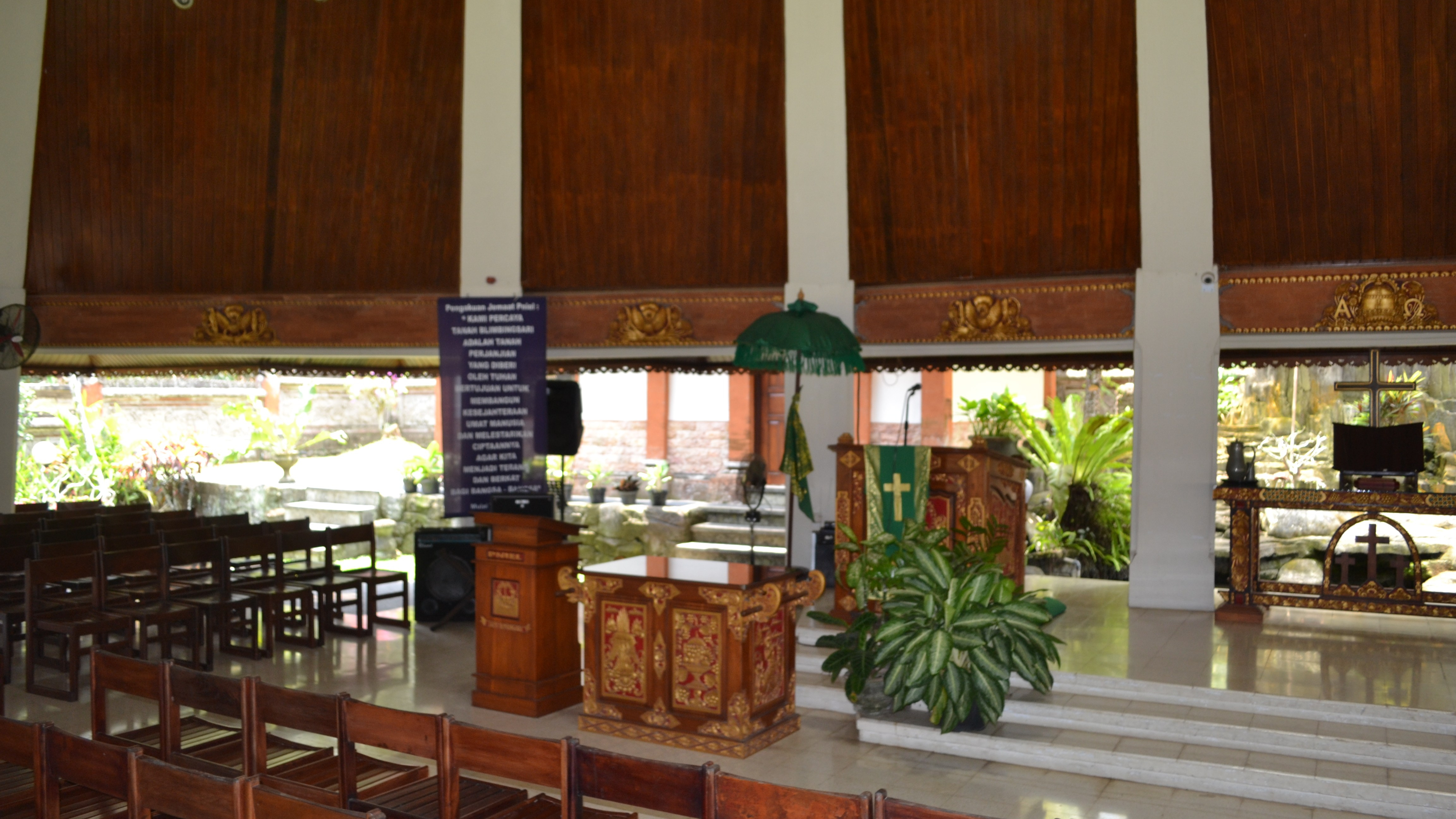 It is a special church, because it is completely open. Through the main gate, in Balinese style, you enter the inner area, this gate is only open on Sundays for the church service. There is no church tower or bell, there is a kind of bell which is also used in the Hindu temple to let people know that there is a ceremony or a gathering. Furthermore, many things are the same as in other Protestant churches, a high roof, a pulpit, and the Greek characters Alpha and Omega. Also the sculptures in Balinese style are there only what it portrays is based on the Protestant faith.
