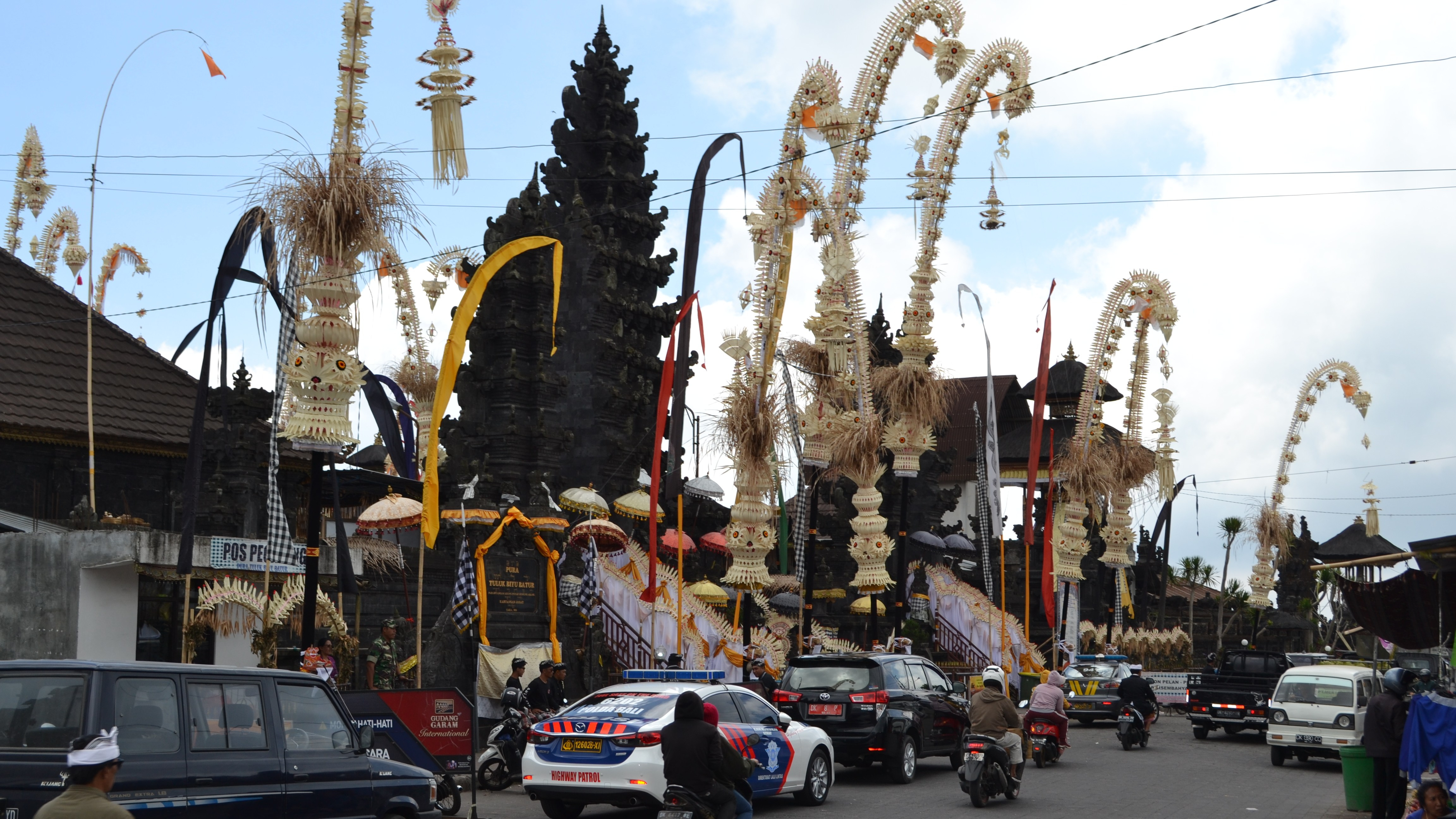 After the coffee we drive on and arrive in the busy part of Kintamani where the Batur temple is located. There is a ceremony and the many cars are parked double on the street, trucks which transport the people of the orchestra who are waiting for what is to come and kill the time with playing Balinese music, of course this causes a traffic jam but nobody is bothered by it.