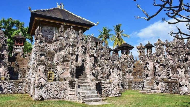The temple is dedicated to Batara Meduwe Karang (God of the ground). The temple ensures divine protection of crops and fertile soil. At the entrance there are three rows of Ramayana statues.