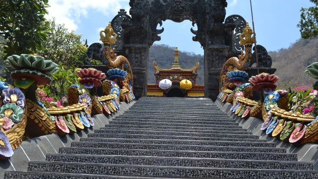 This temple is located in the village of Banyupoh, close to Pemuteran, passing Pulaki (which is also an option to visit), the Melanting temple is more inland while Pulaki is located on the coast. A beautiful temple and it is striking that all statues and temples have bright colours. The Melanting temple is considered the place where his eldest daughter of the Javanese Hindu priest Danghyang Nirartha, Ida Swabawa, changed into a ghost. There is a kind of information desk where you can borrow a sarong, and to get to the temple you have to climb quite a few stairs, the stairs look new and look very nice with all the little stones in a kind of mosaic.